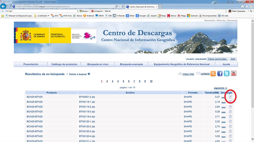 Entro en IGN, me identifico, selecciono el BCN25/BTN25, escojo Provincia y la provincia en cuestión, le doy al botón Buscar, me aparecen las cuadrículas y cuando voy a picar en el iconito de la derecha de cada línea (de cada archivo), para descargarla, no hace nada. Aparece la mano como si pudieras picar, pero cuando picas, no hace nada.