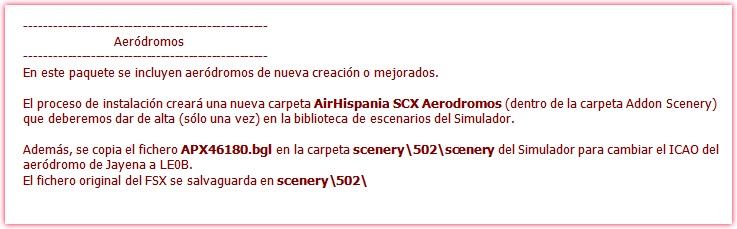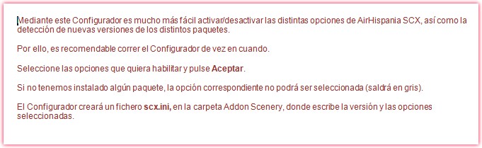 Resulta que siguiendo este link http://www.airhispania.com/moddoc01.php ... 1101120945, me voy descargando los diferentes escenarios, al igual que el configurador. Según yo he entendido hay que instalar los diferentes paquetes (aquellos que nos interesen, las librerías son obligatorias) y una vez hecho esto ejecutar el configurador. Bien, hasta ahí todo correcto.