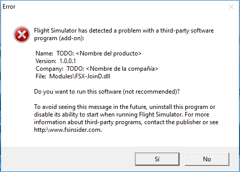 Puede pasarle a cualquiera, ya que como le ha ocurrido a varios compañeros, lo que antes funcionaba, de buenas a primeras, un buen día y sin hacer nada (o nada aparente), deja de funcionar. Es aplicable para cualquier DLL que manifieste este error “Flight Simulator has detected a problem with a third-party software program (add-on)”