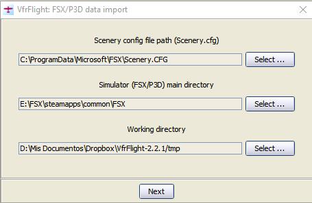 12) En Tools - Import FSX/P3D data - colocaremos los caminos correctos a nuestro FSX. Pulsar NEXT.