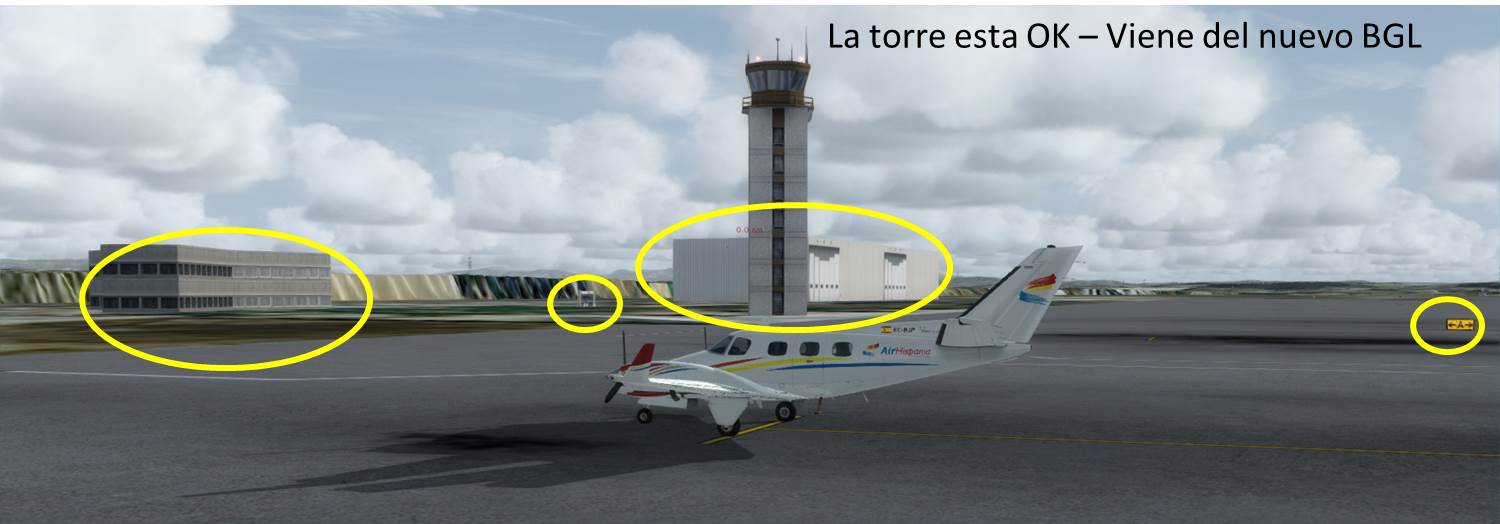 (2) Me aparecen edificaciones (de objetos 3d?) que debemos quitar y/o poner/reemplazar como sea el caso. Pero no es obvio de donde salen estos. Nótese que he deshabilitado el AD original del simulador cambiando la extensión del fichero `APX48170.BGL" en el directorio Scenery\0602 original del simulador. Pero, esto no me ha quitado los objetos.