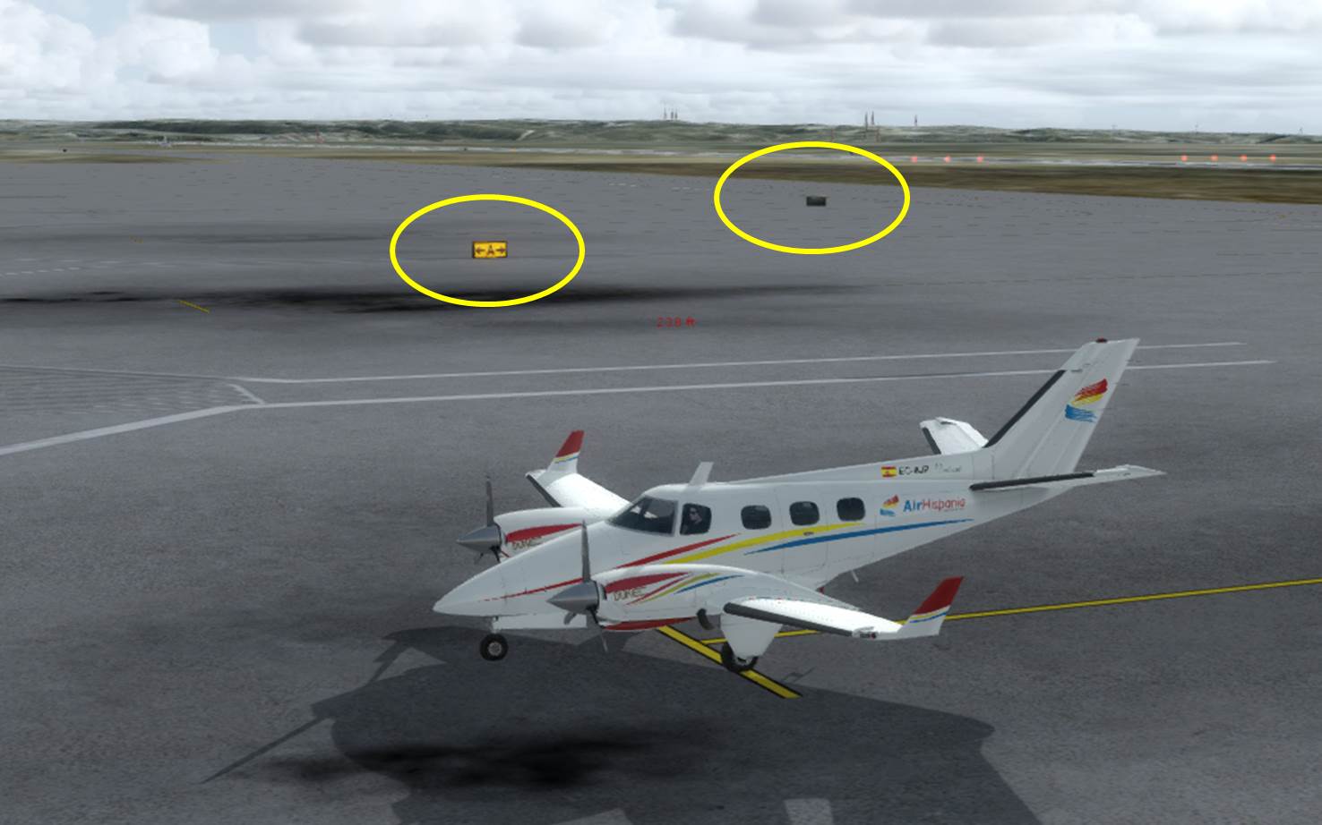 Aun no se le han cambiado los objetos 3D hasta no solucionar algunas cosas como muestran las imágenes abajo, tomadas con la aeronave en el parking 5 (creo) :
