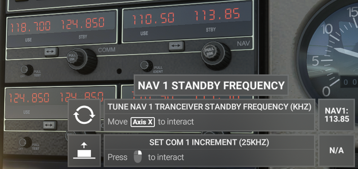 No se si te refieres exactamente a esto, pero la forma de "pulsar" algunos botones es mantener pulsados a la vez el pulsador derecho y el izquierdo del mouse, poniéndote encima del botón a pulsar. Se emplea habitualmente para cambiar entre los dos VOR o las dos radios para sintonizar las frecuencias.