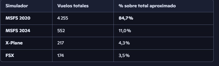 *(El % se calcula sobre el total de vuelos sumando todas las plataformas. FSX incluye P3D)*