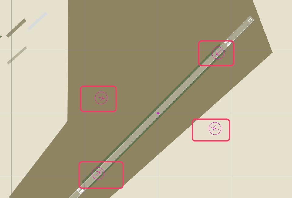 Posicioné tres parking gate small y las taxiways hacia la pista, tratando de que la vista en