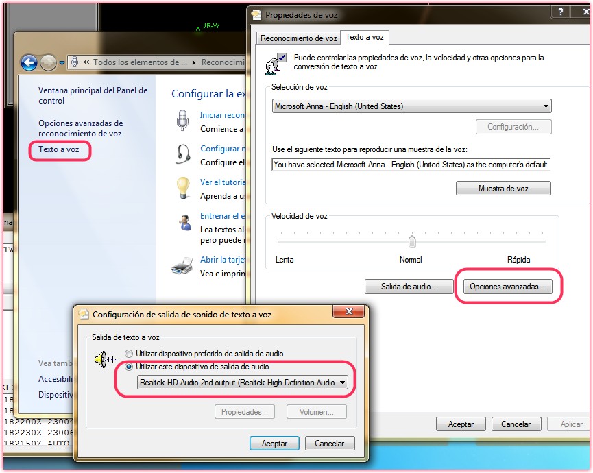 Ahí tenéis una opción que es "Texto a voz", donde os aparecerá una ventana. Seleccionar el botón "Opciones avanzadas" y podréis elegir por que dispositivo sale el sonido de nuestra amiga "Anna".