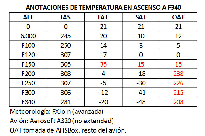 Al avión no le pasa nada, pero he repetido el vuelo LEMH/LIMC, ahora con la meteo "avanzada" y no he tenido ningún problema. No obstante, he tomado datos de indicada y temperaturas a distintos niveles y se ven algunas irregularidades. Pongo una tablica que resume los datos Se ven varias cosas:
