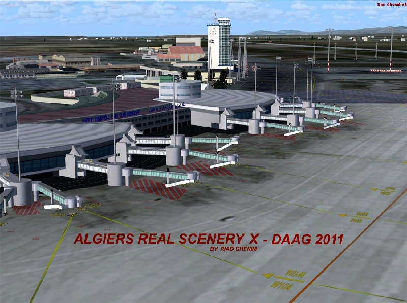 En este enlace externo han publicado un buen escenario gratis para el aeropuerto de Alger, en Argelia ICAO DAAG. Este es un aeropuerto cercano a la península Ibérica, convenientemente ubicado para quienes gusten de cruzar el mediterráneo en vuelos relativamente cortos.