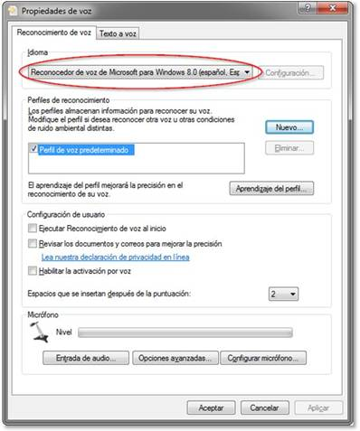 - Verifica que tengas instalado y activo el reconocimiento de voz en Windows para el Idioma Español de España (parece una chorrada, pero es que hay doscientos idiomas españoles, je, je, je…).