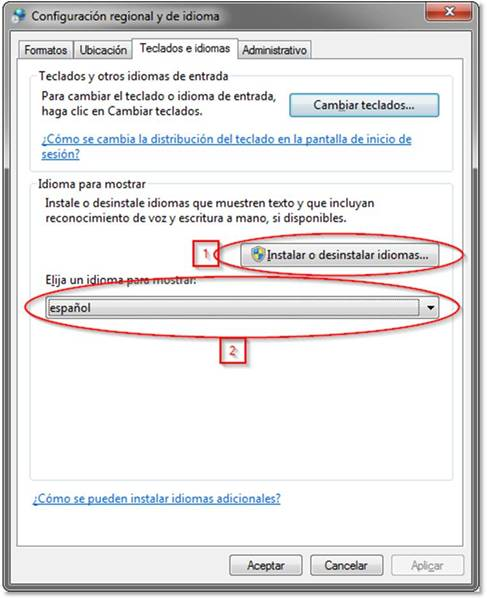 - Te vas a “Panel de control\Reloj, idioma y región\Configuración regional y de idioma” y tienes que instalar el idioma español (1) (casi seguro que ya lo tienes instalado) y seleccionarlo en el combo (2):
