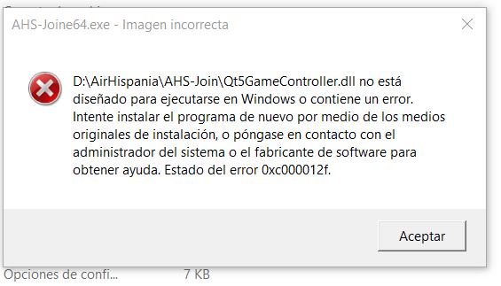 El problema parece que lo tienes localizado en esa DLL (Qt5GameController.dll), en el que por algún motivo (antivirus, quizás...¿?) puede que no se te haya copiado bien. Bórrala, o renómbrala y vuelve a ejecutar el AHS-Join. Él se dará cuenta que le falta esa DLL y te la actualizará desde el servidor de AirHispania. A ver si ahora te la instala correctamente...