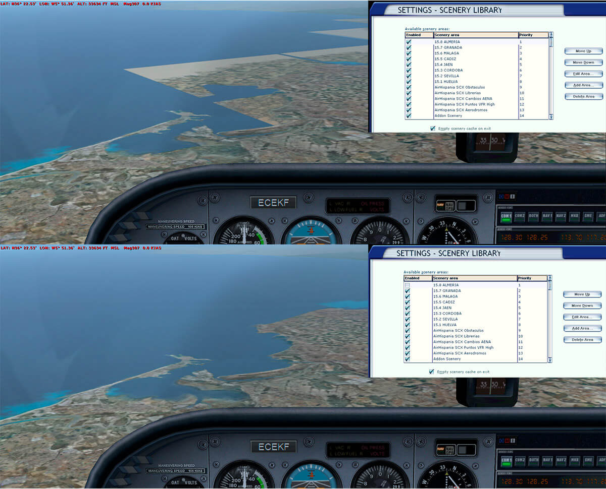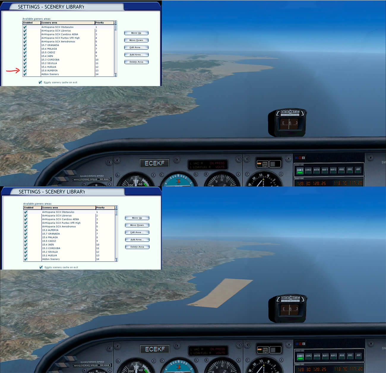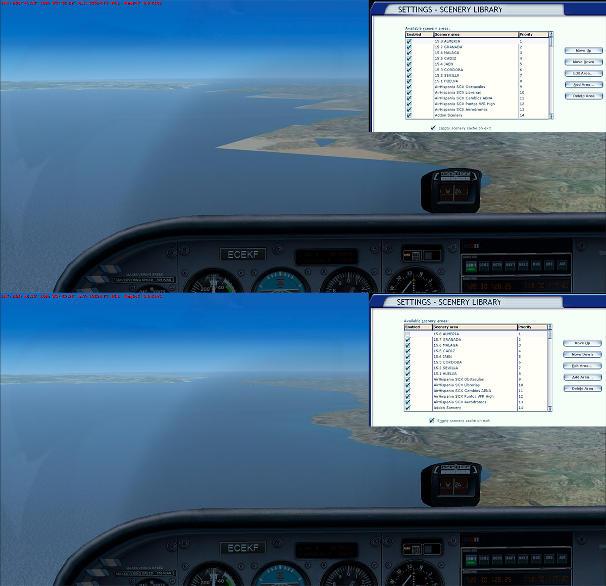 Pues lo cierto es que ese pequeño gran error está, como en su dia dije, en un pequeño archivo de exclusión que efectivamente se repite en todas las provincias, pero que en la de Almería (que fué la primera que publiqué) se coló con un error que afecta a la costa. Al publicar el resto de provincias contaba con que el archivo sería sobreescrito con los siguientes escenarios, puesto que siempre he recomendado que todos escenarios se instalen juntos, es decir en la misma carpeta scenery para ANDALUCIA. De lo contrario podrías encontrarte algún fallo más en las zonas de corte entre provincias. Es así como están probados.